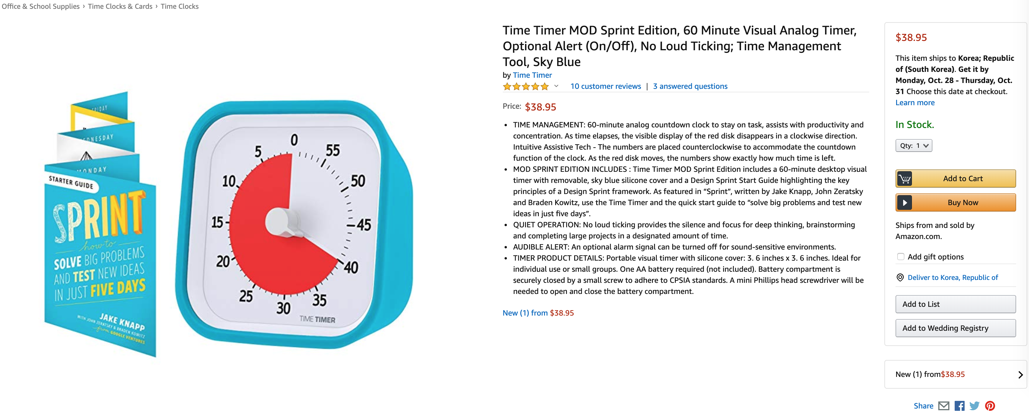 아마존에서 파는 타임타이머 38.95달러 저는 시험공부나 과제할 때 딴 짓을 안하기 위해서 이 타임타이머를 사용하려고 했는데 실제로 구입하기에는 너무 부담스러운 가격이었습니다. 저 같은 학생 말고도 엄마들이 아이들의 시간을 관리하기 위해서 타임타이머를 많이 사용한다고도 하더라고요.